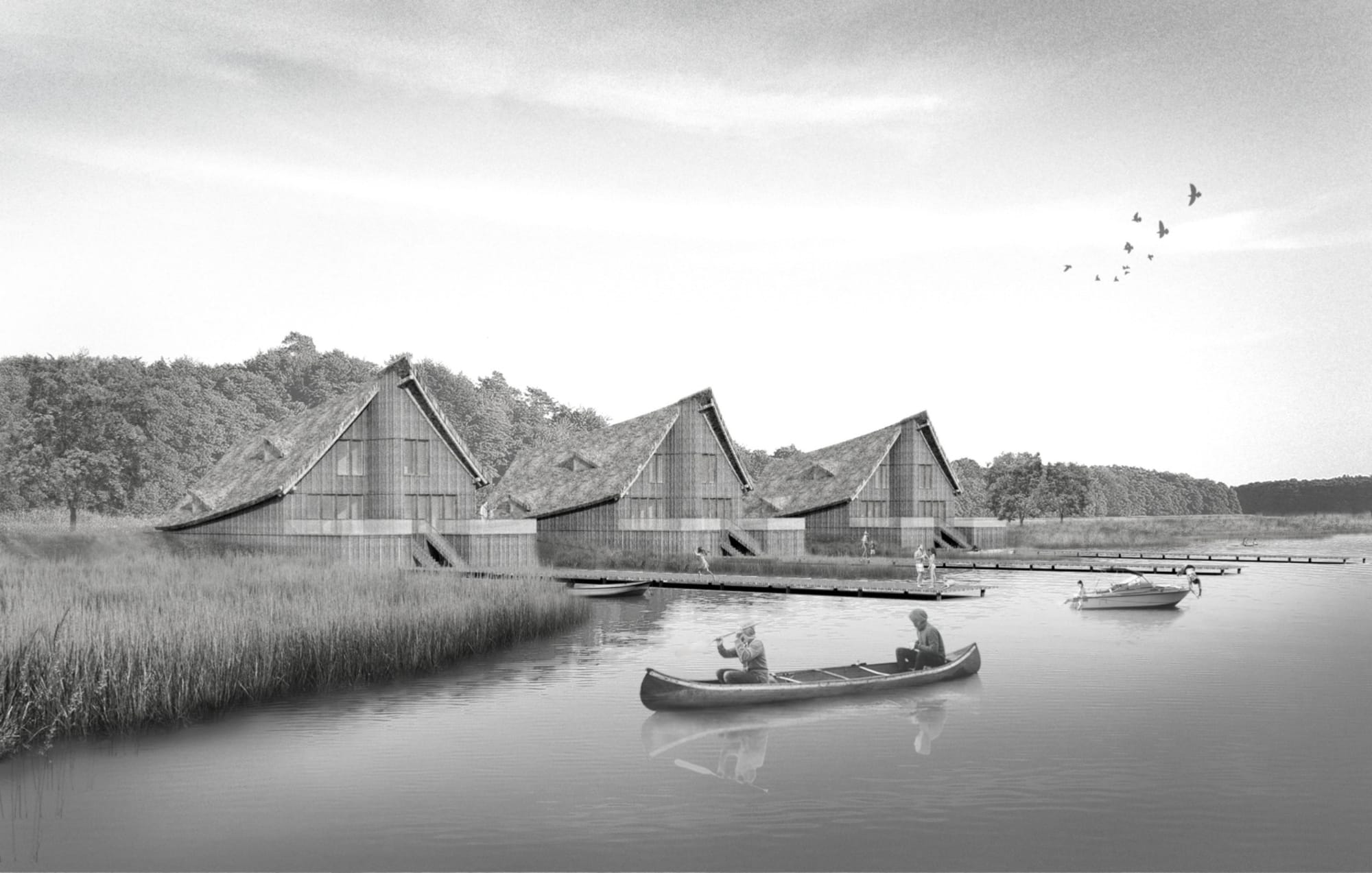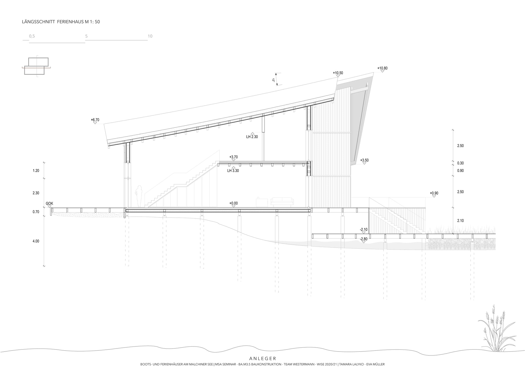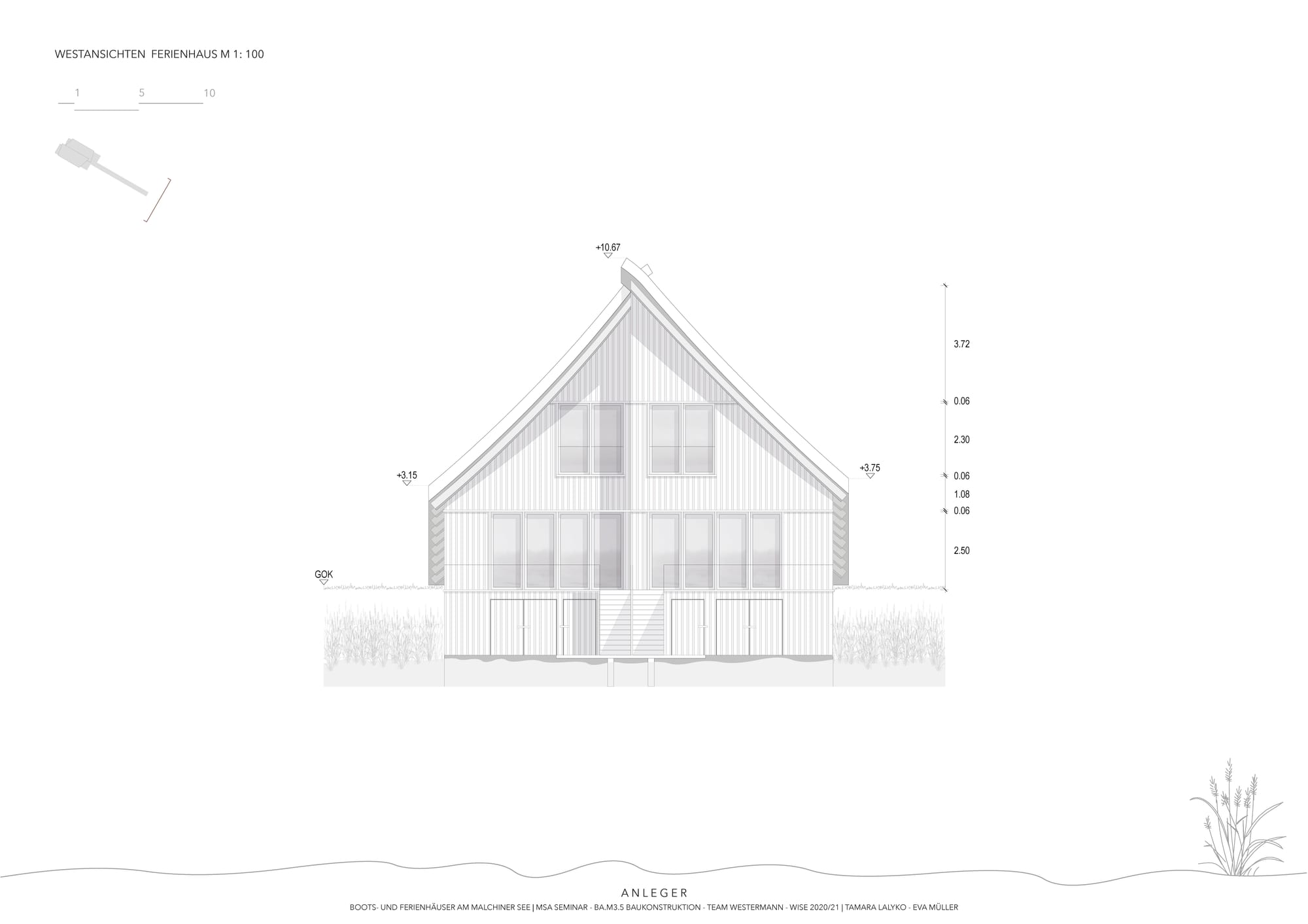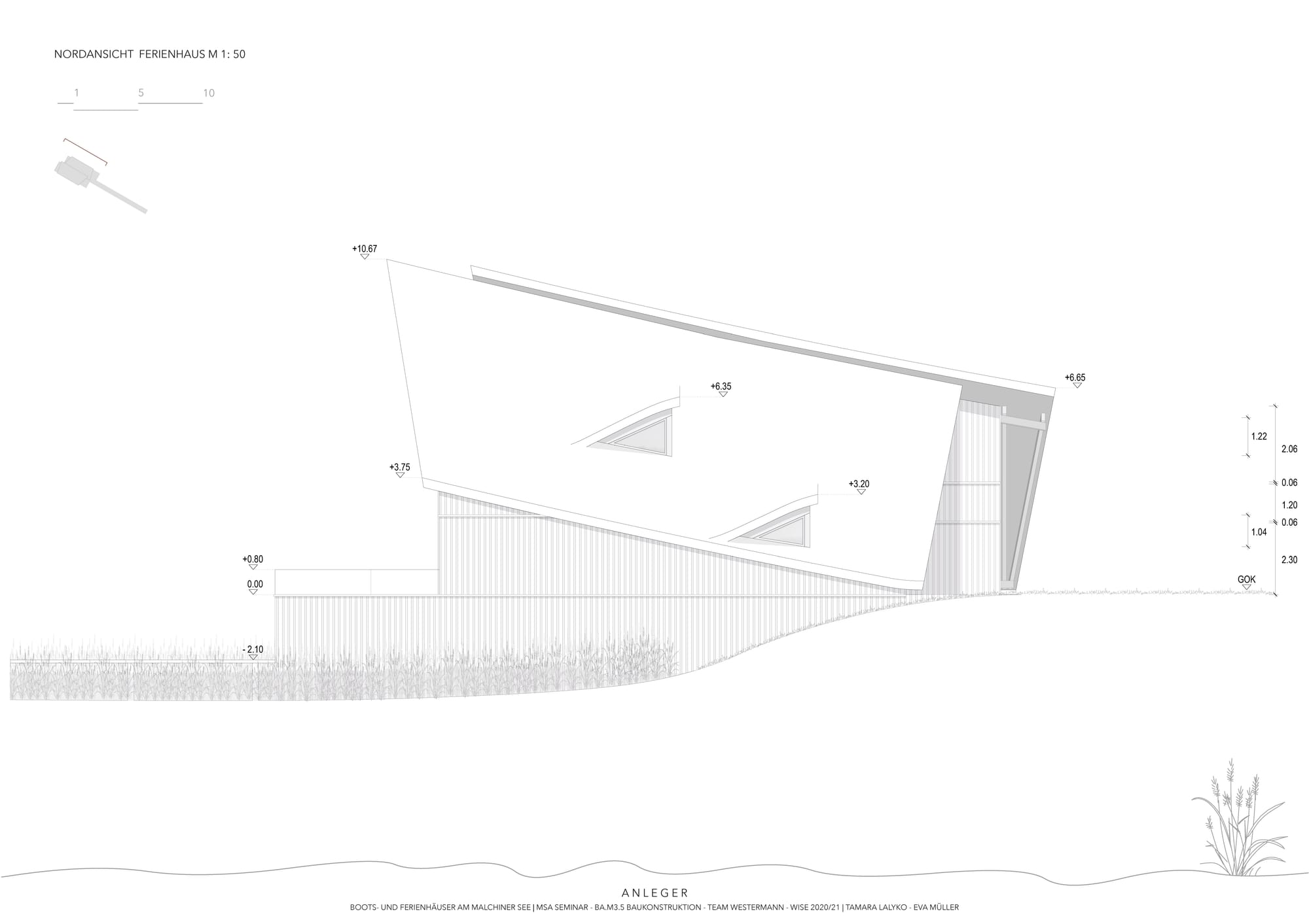 Right at Lake Malchin, part of the lake area of Mecklenburg, close to the village of Bristow, there is a desolate waterfront site surrounded by nature. Currently, several holiday houses built in the GDR times occupy the site. Each home includes