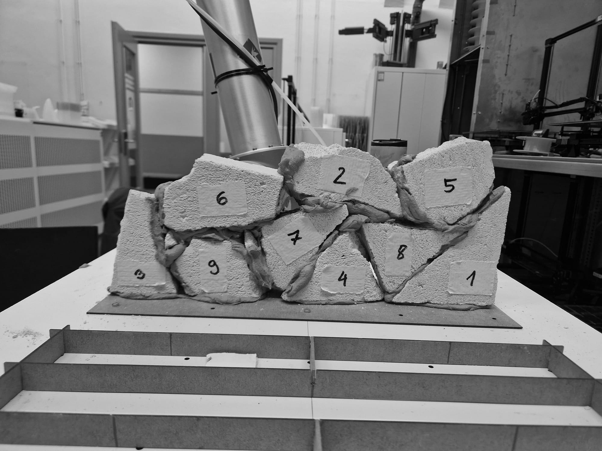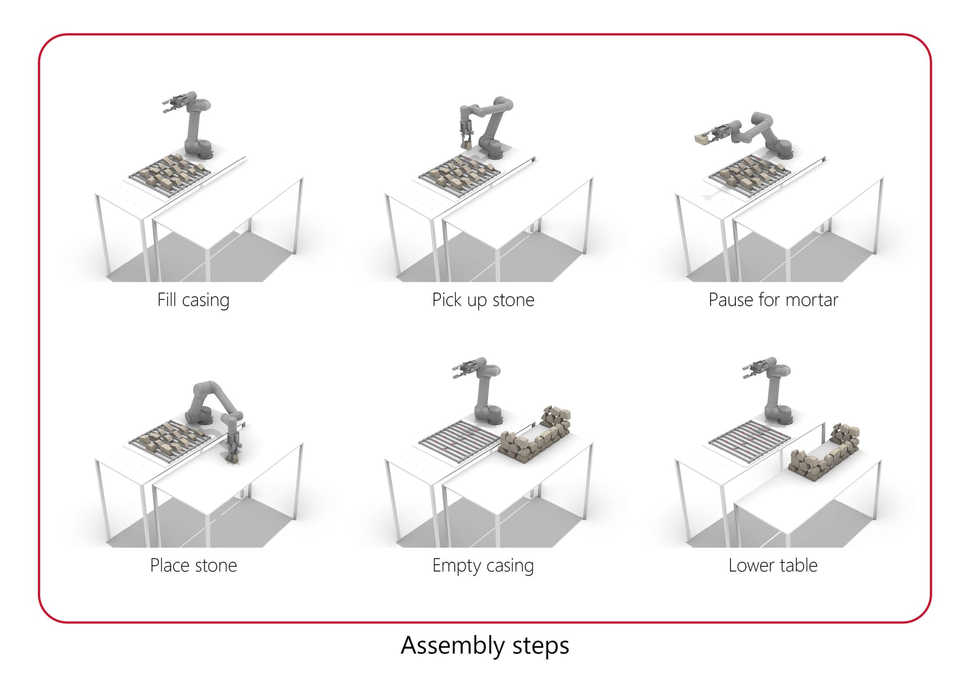 The wall is scaled 1:5 for assembly with a UR5 robot and custom air-pressure gripper, enabling flexible human–robot collaboration. The robot places stones in rounds of 15, pausing for mortar application, refilling, and for humans to adjust rows with small stones. A height-adjustable table extends the workspace, allowing the prototype to be built higher and lowered for access to upper rows.