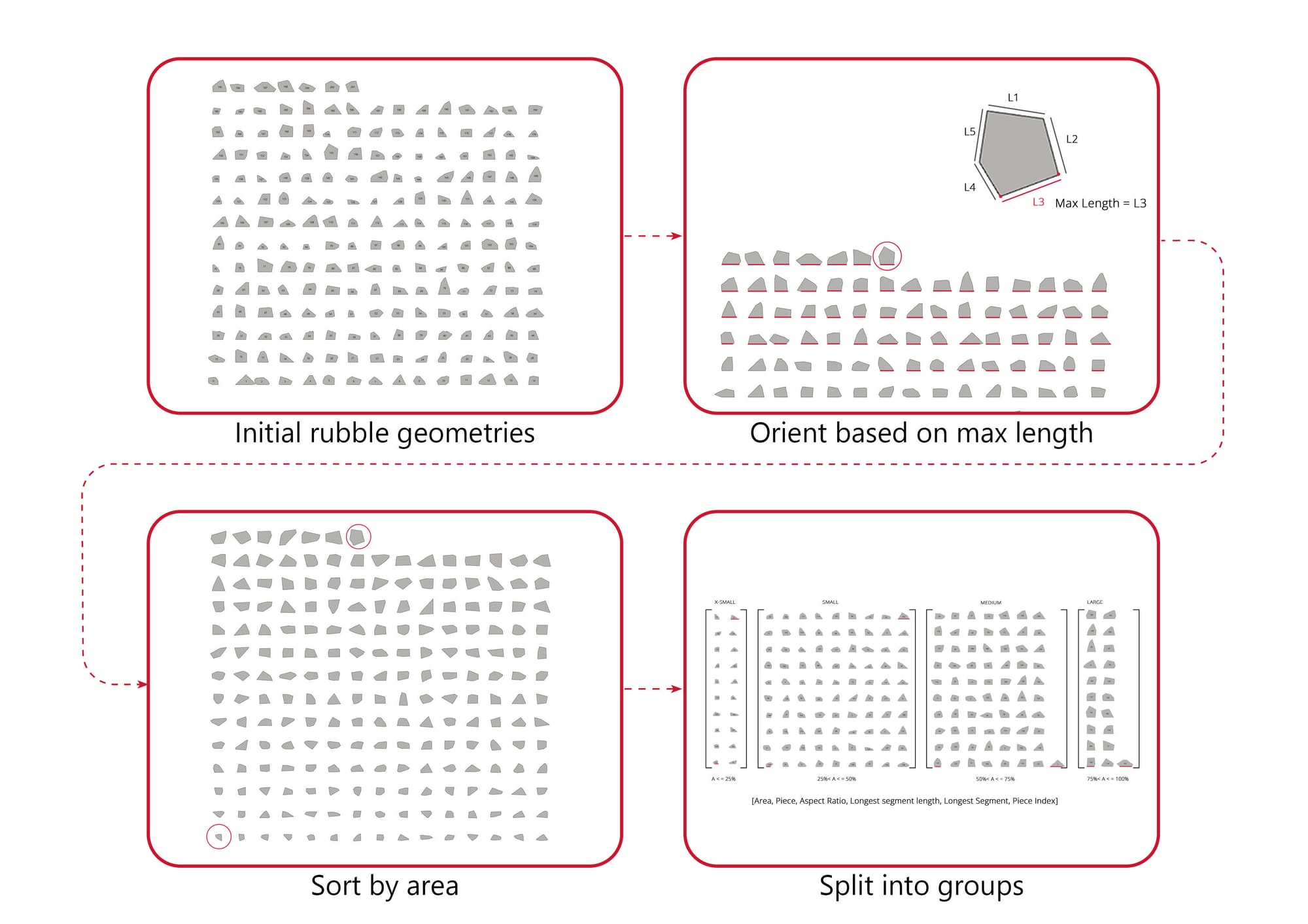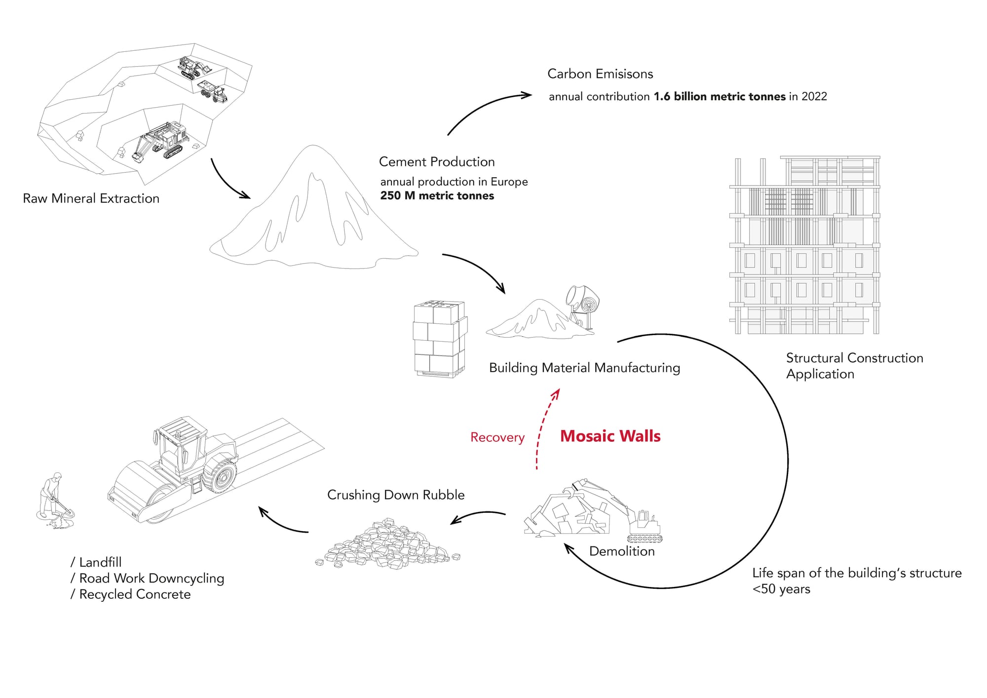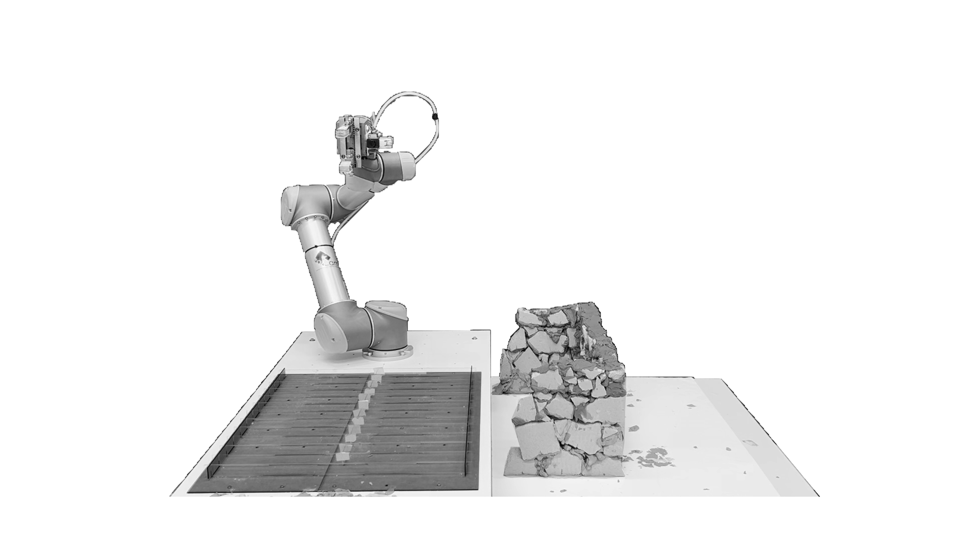However, avoiding concrete can be tricky since few alternatives meet the material properties and have lower embodied carbon and cost. Meanwhile, the vast amount of concrete produced gets either landfilled or downcycled. In the best case, it ends up as an aggregate for recycled concrete or as filling material for road works. Proper reuse of the rubble as a structural material presents vast challenges. It is heavy and irregular; therefore, it is difficult for humans to efficiently process, sort, and assemble new products from the rubble.