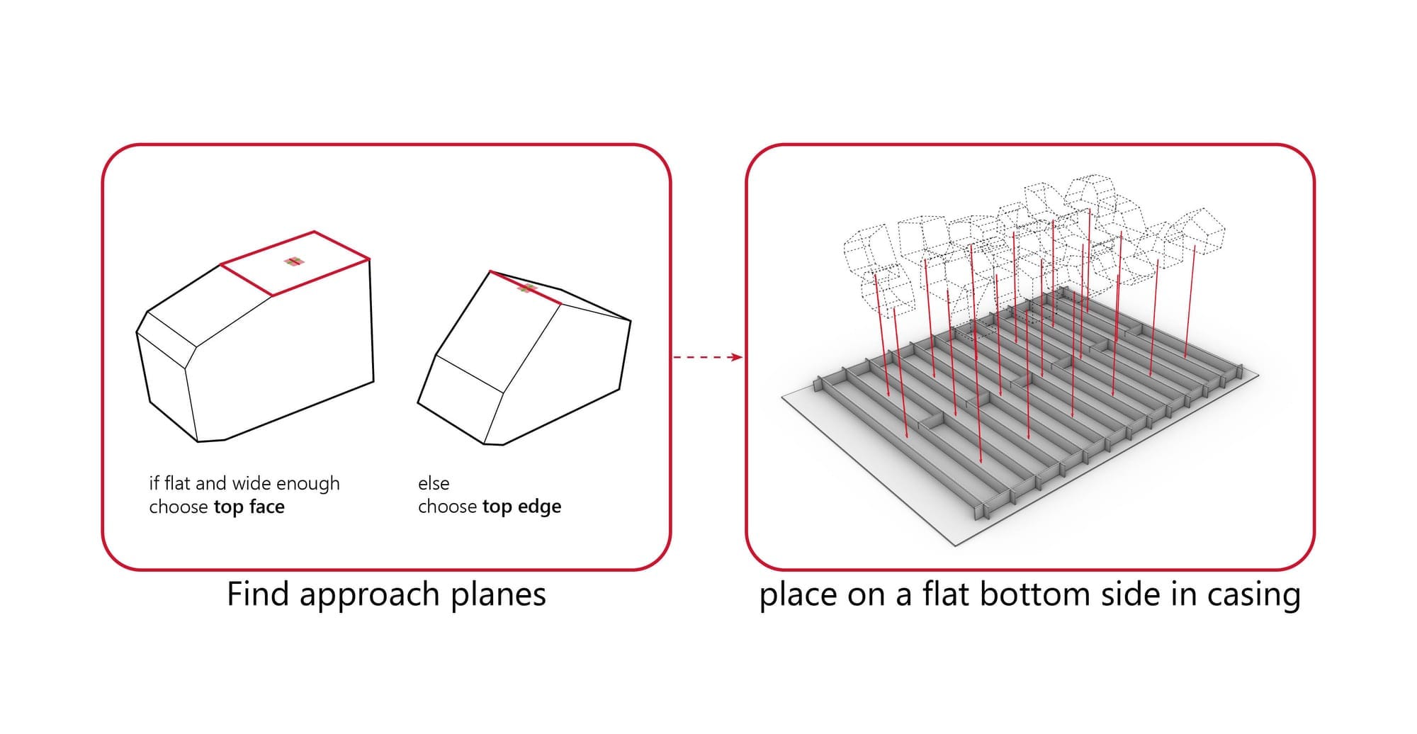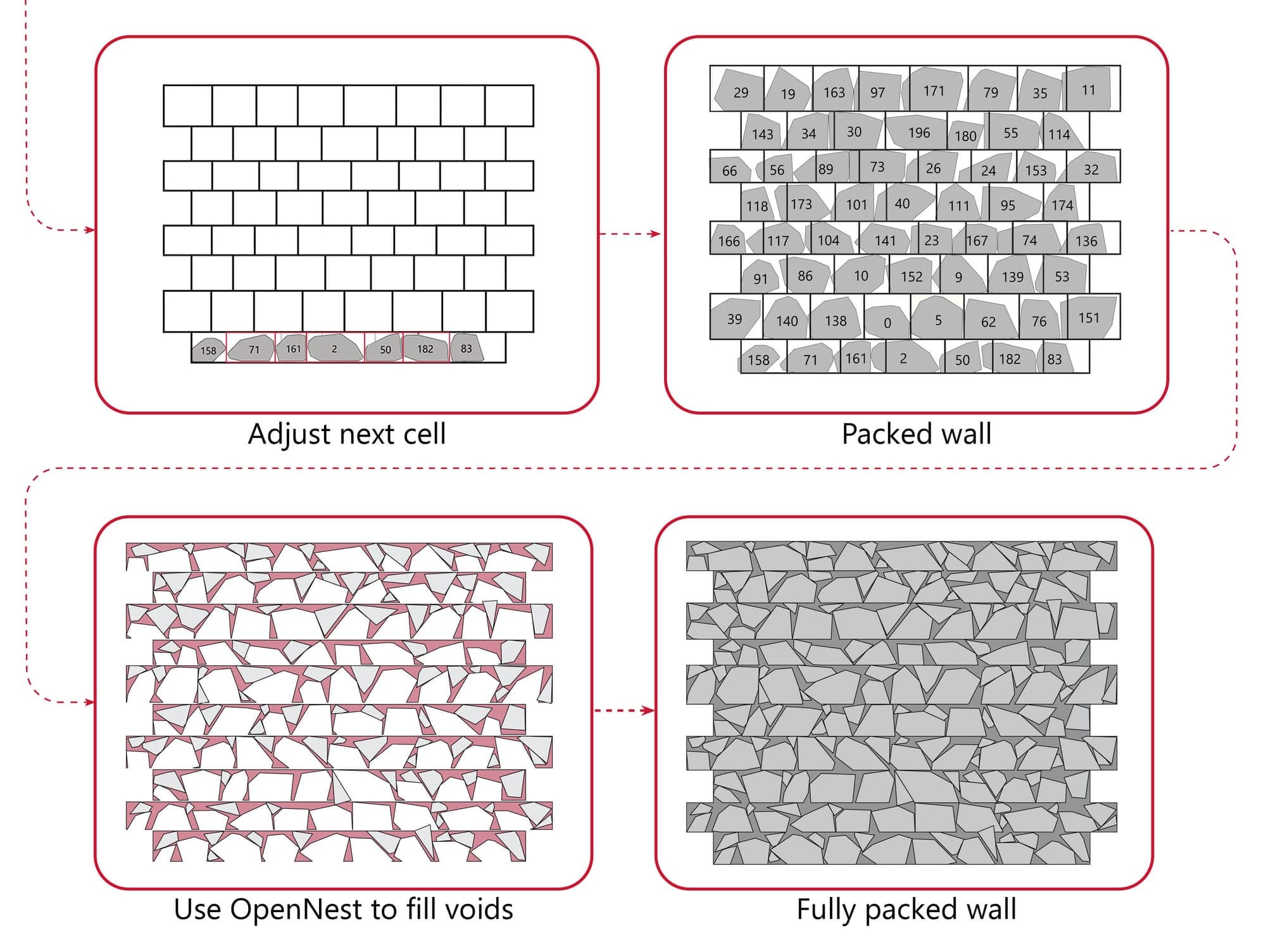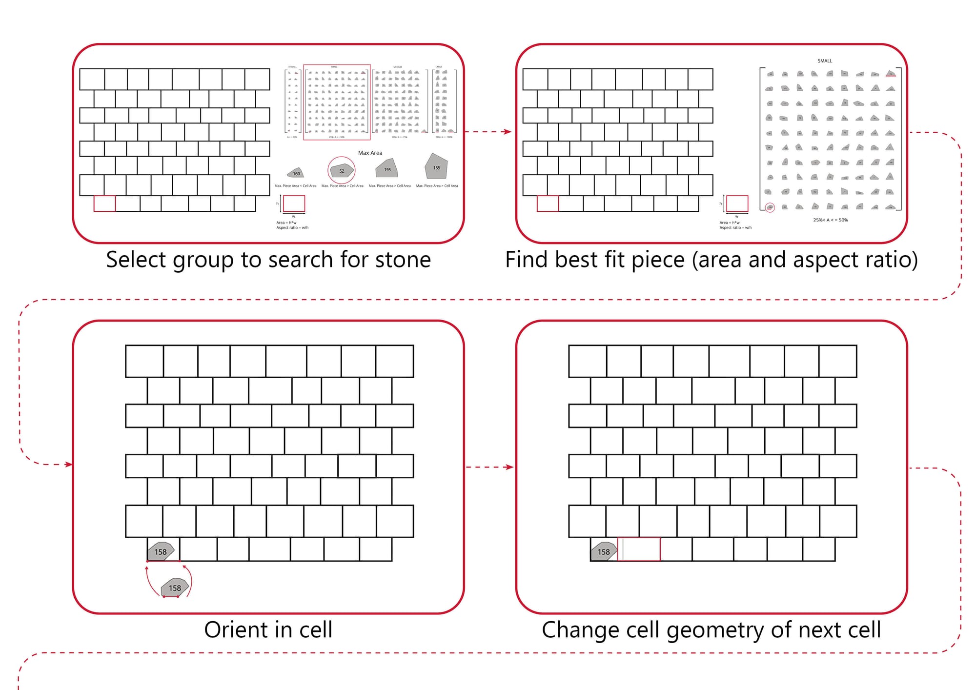 The packing algorithm matches tessellation cells with the best-fitting stones by comparing cell area and aspect ratio to precomputed stone properties. Stones are oriented to align with the cell’s base, checked for fit, and placed to minimize gaps, with adjustments made to adjacent cells.