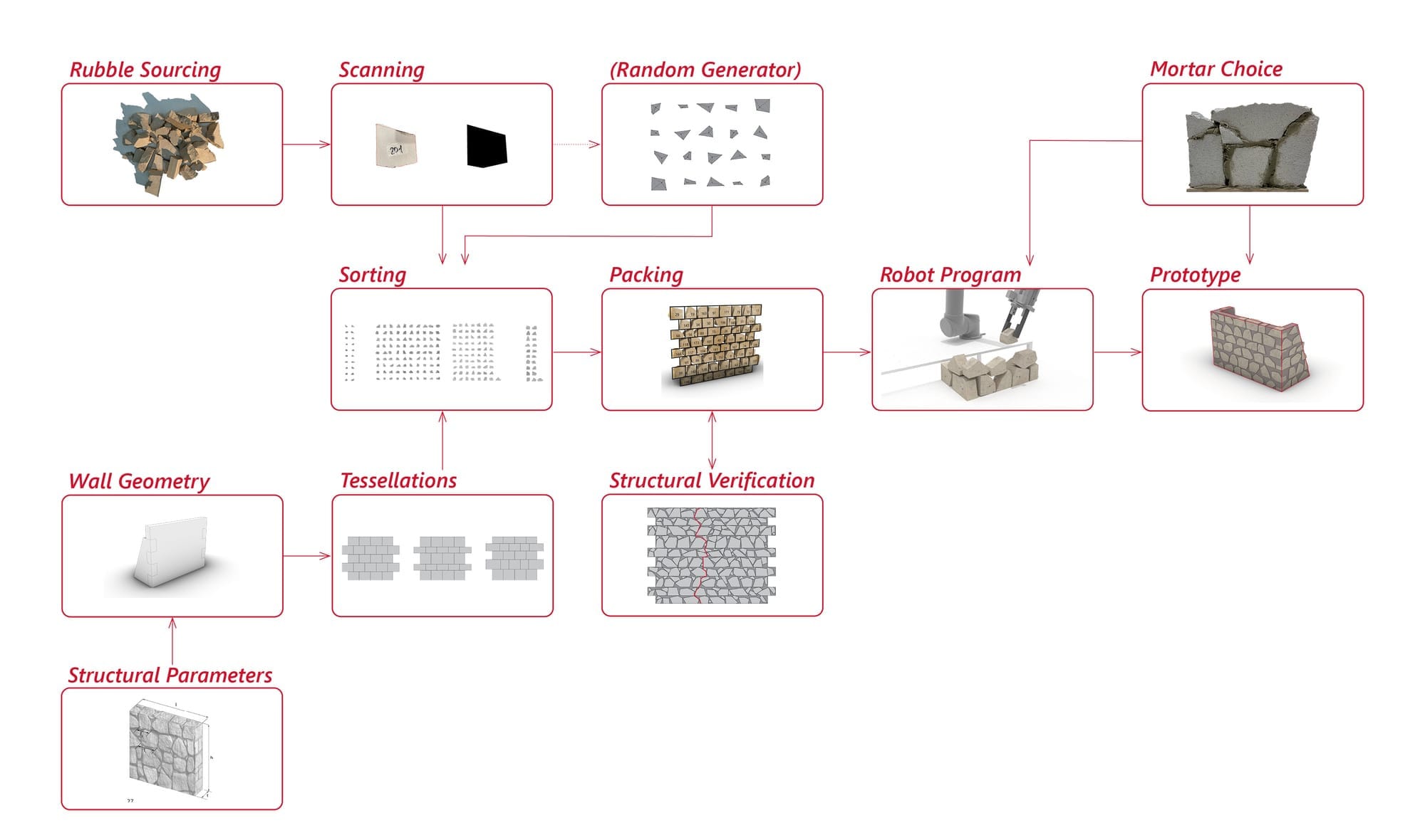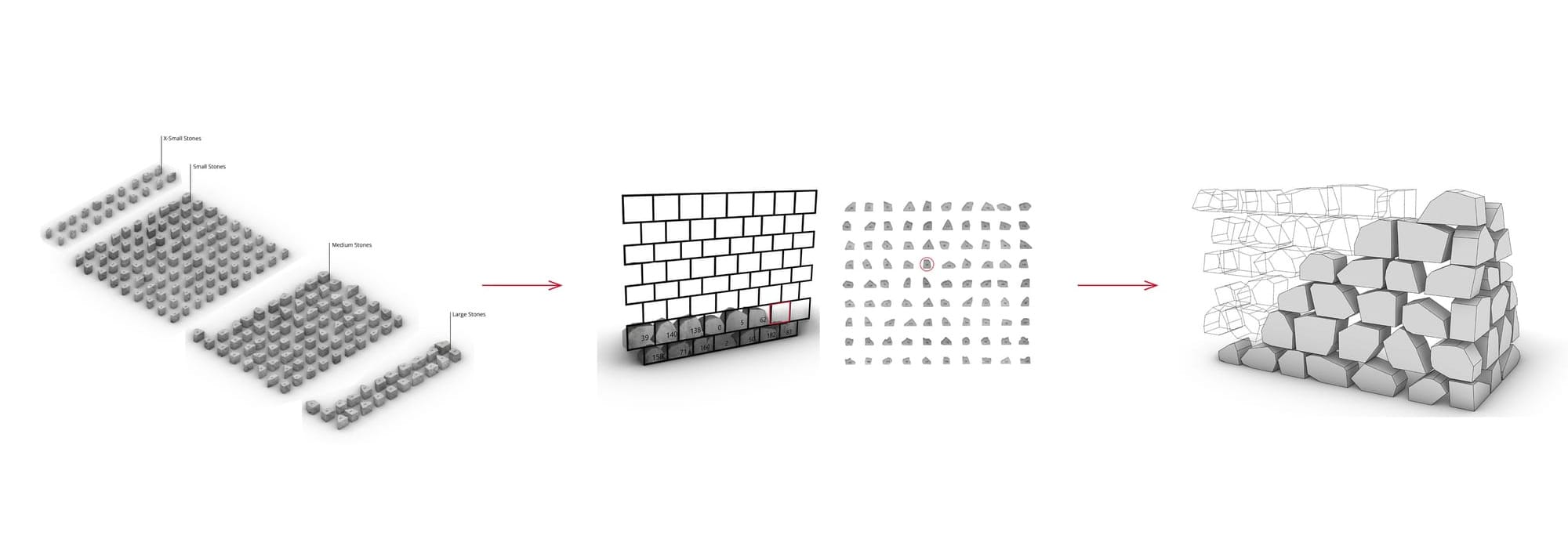 This project explores the use of robotics in the construction industry to tackle challenges that exceed human capabilities. We use computational design processes to redesign concrete walls out of rubble stone to reduce embodied carbon emissions.
