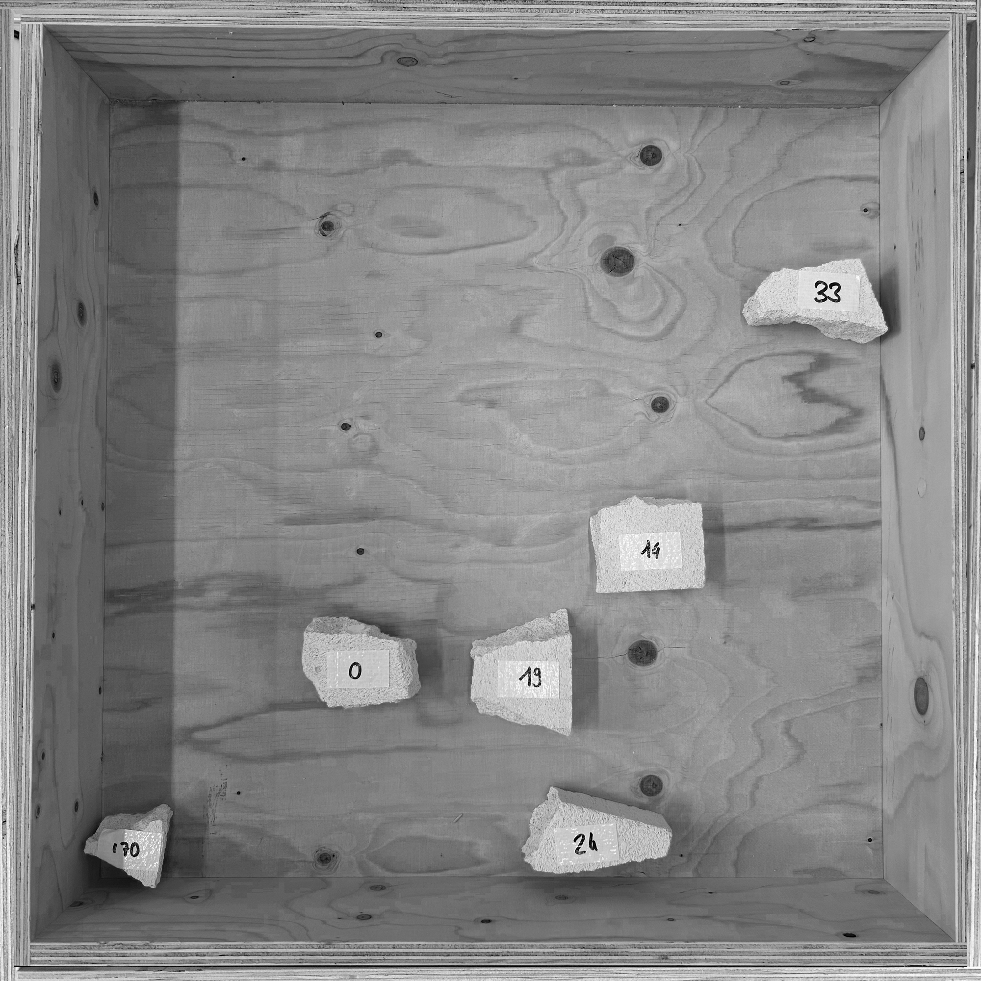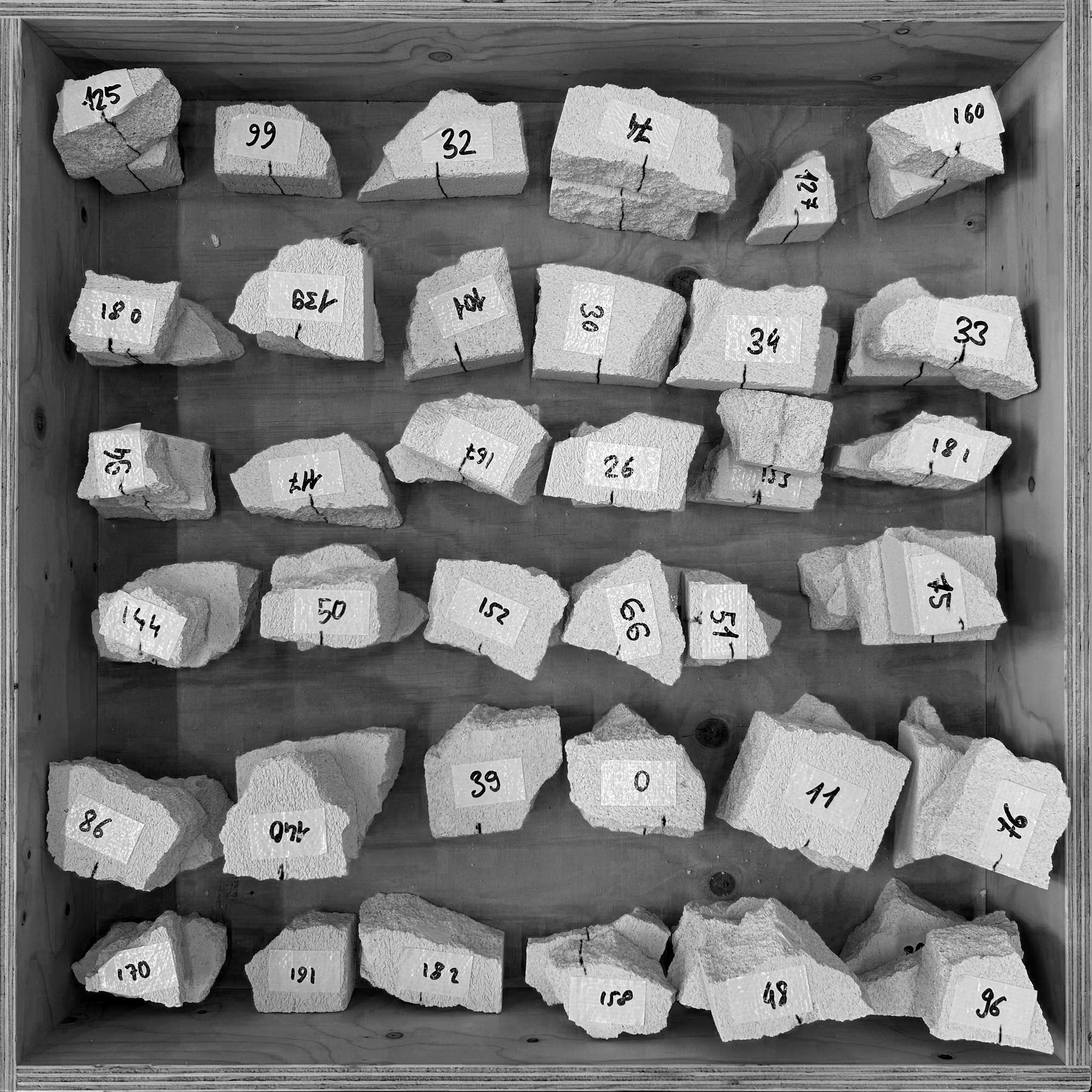 Stones were scanned on 200×200 mm black paper using an iPhone mounted on a custom tripod, ensuring all images were comparable. Each 50 mm-thick stone was photographed from a consistent 405 mm height. Stones were numbered, scanned in sequence, and placed into labeled buckets of 40. Two people scanned 201 stones in about two hours, enabling easy retrieval for prototype building.