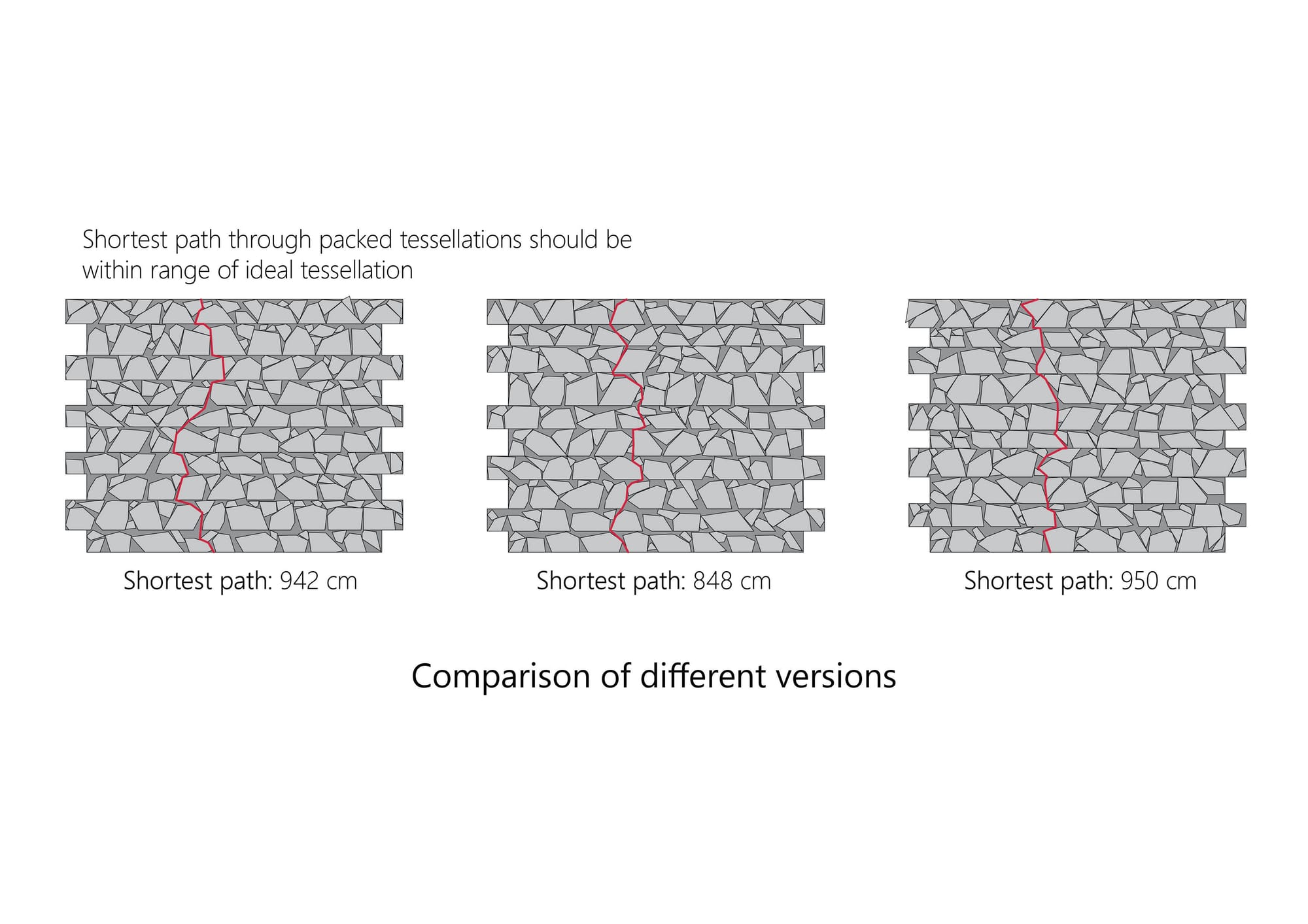 The shortest path through mortar under load indicates likely failure. Comparing this path in target and packed rubble walls can predict structural performance. Future tests on walls with the same tessellation could build a performance database.
