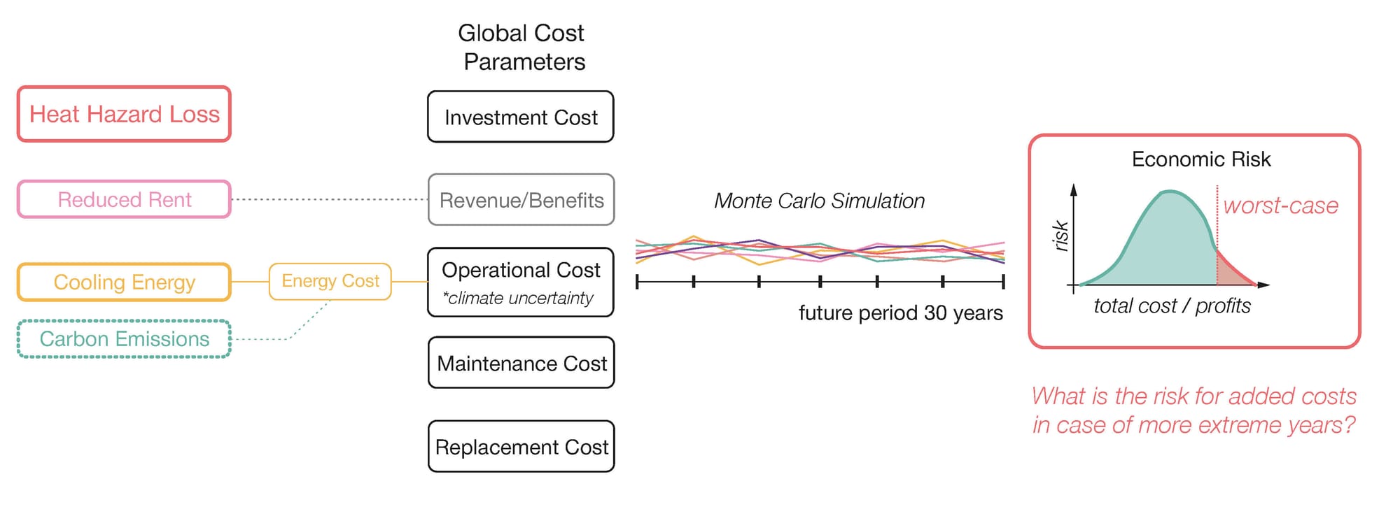 This study addresses this gap by integrating heat hazard loss as cost into a probabilistic cost-benefit analysis to assess the long-term benefits of improving resilience. The method can assist in decision-making when retrofitting by informing about the financial feasibility of mitigation, including the impact of recurring extreme events.