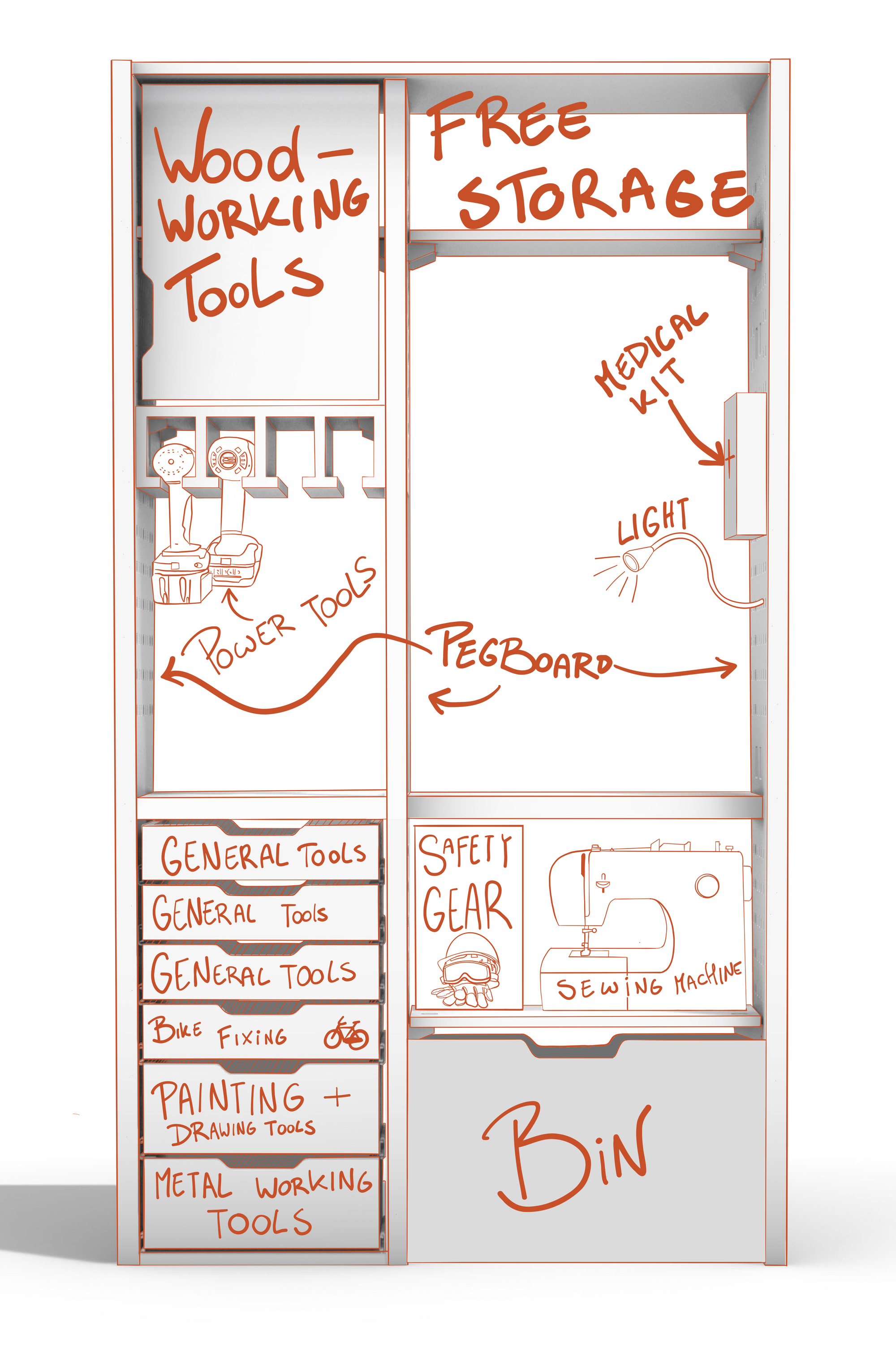 To design it as practically as possible, we sketched it 1:1 on the wall. This method helped us understand the real-life experience when sizing and arranging storage and functionalities.
