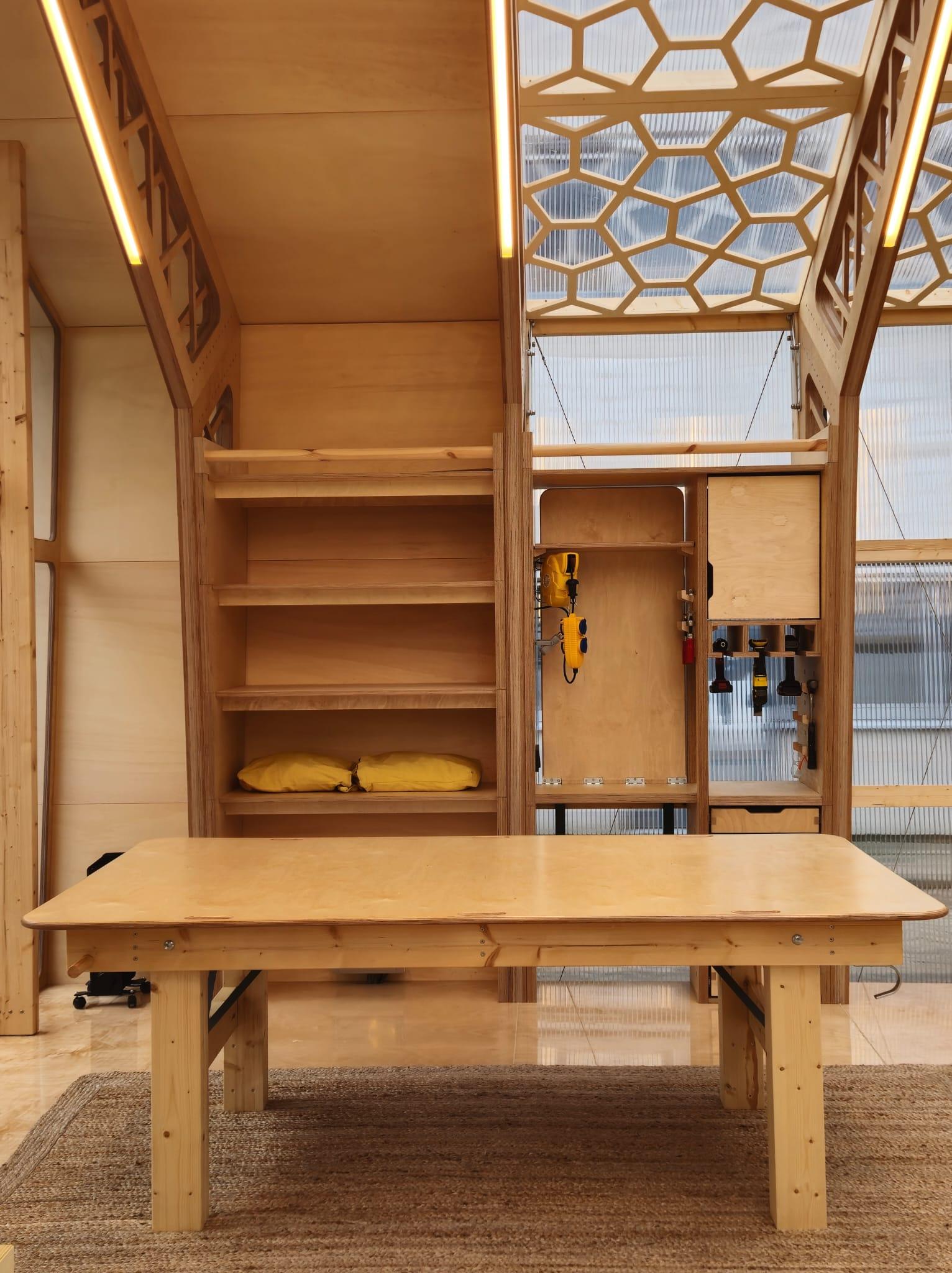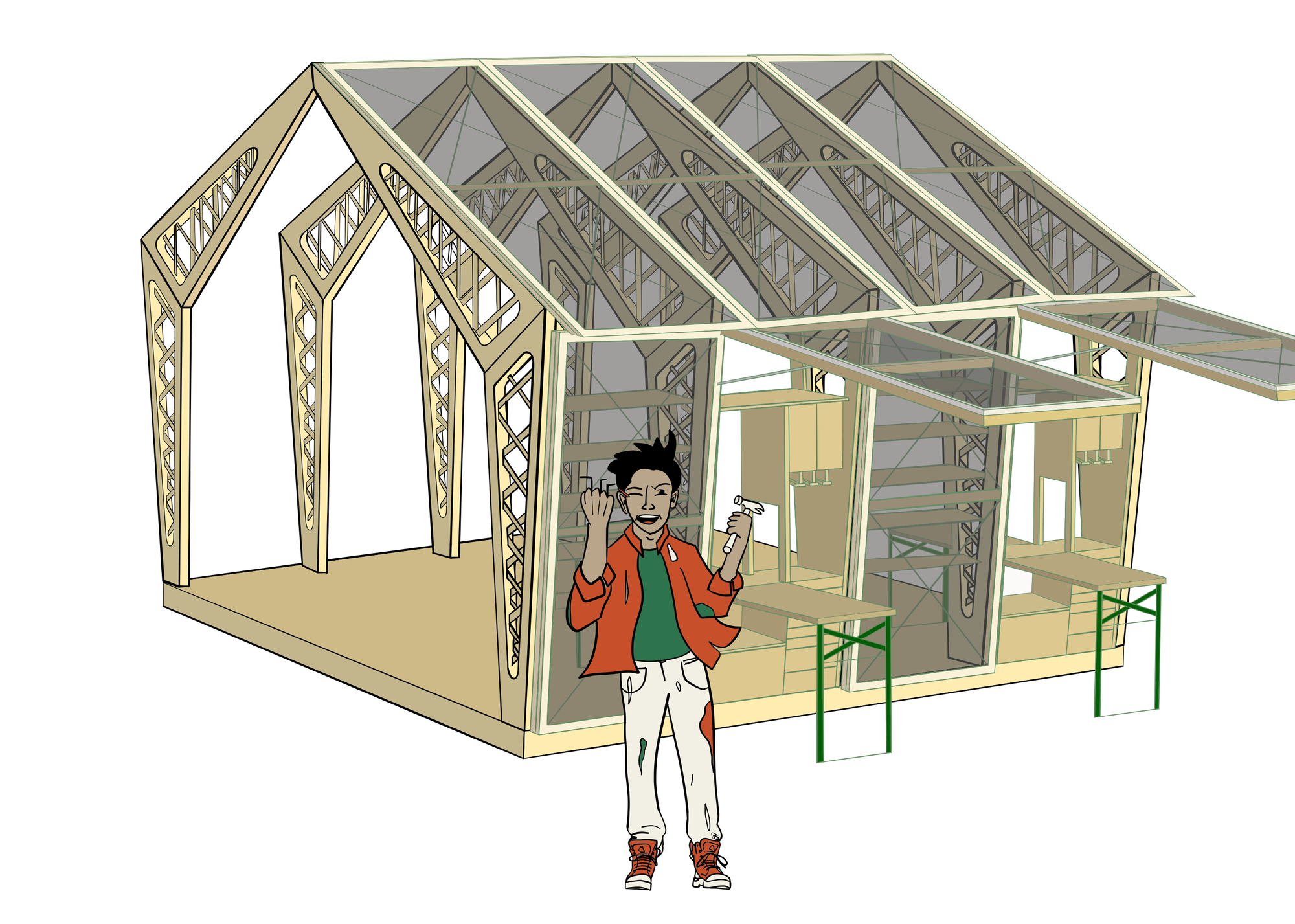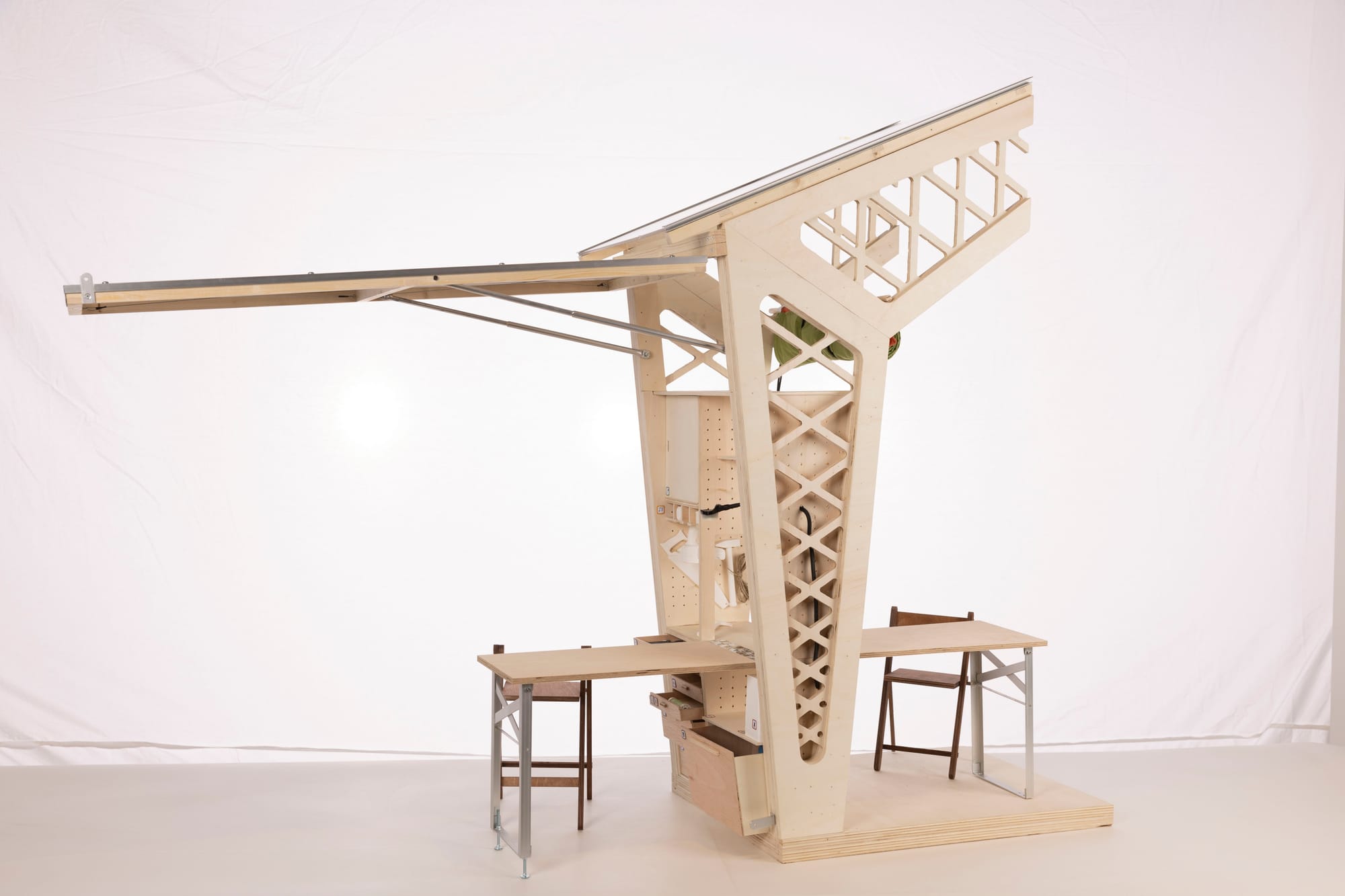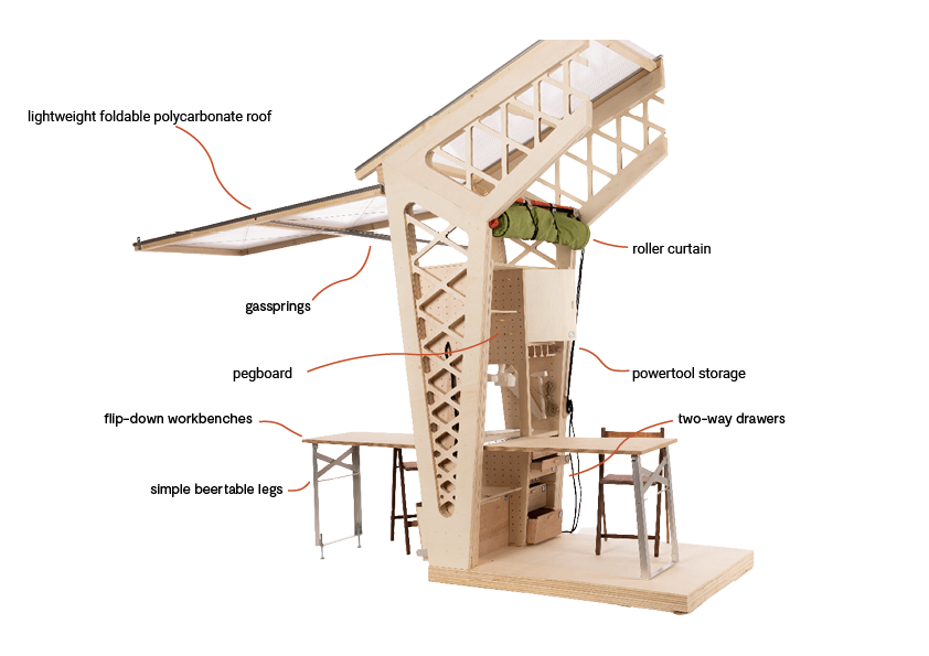 that are stuck together using only friction-fit connections. The assembled workshop shelf unit can be attached to the timber framing with screws, allowing for some flexibility due to built-in tolerance. The Flipshop can be upgraded and extended by a storage shelf unit in the next timber frame module. Finally, we closed the pavilion off to the side with a polycarbonate facade element that can be fixed or flipped up.