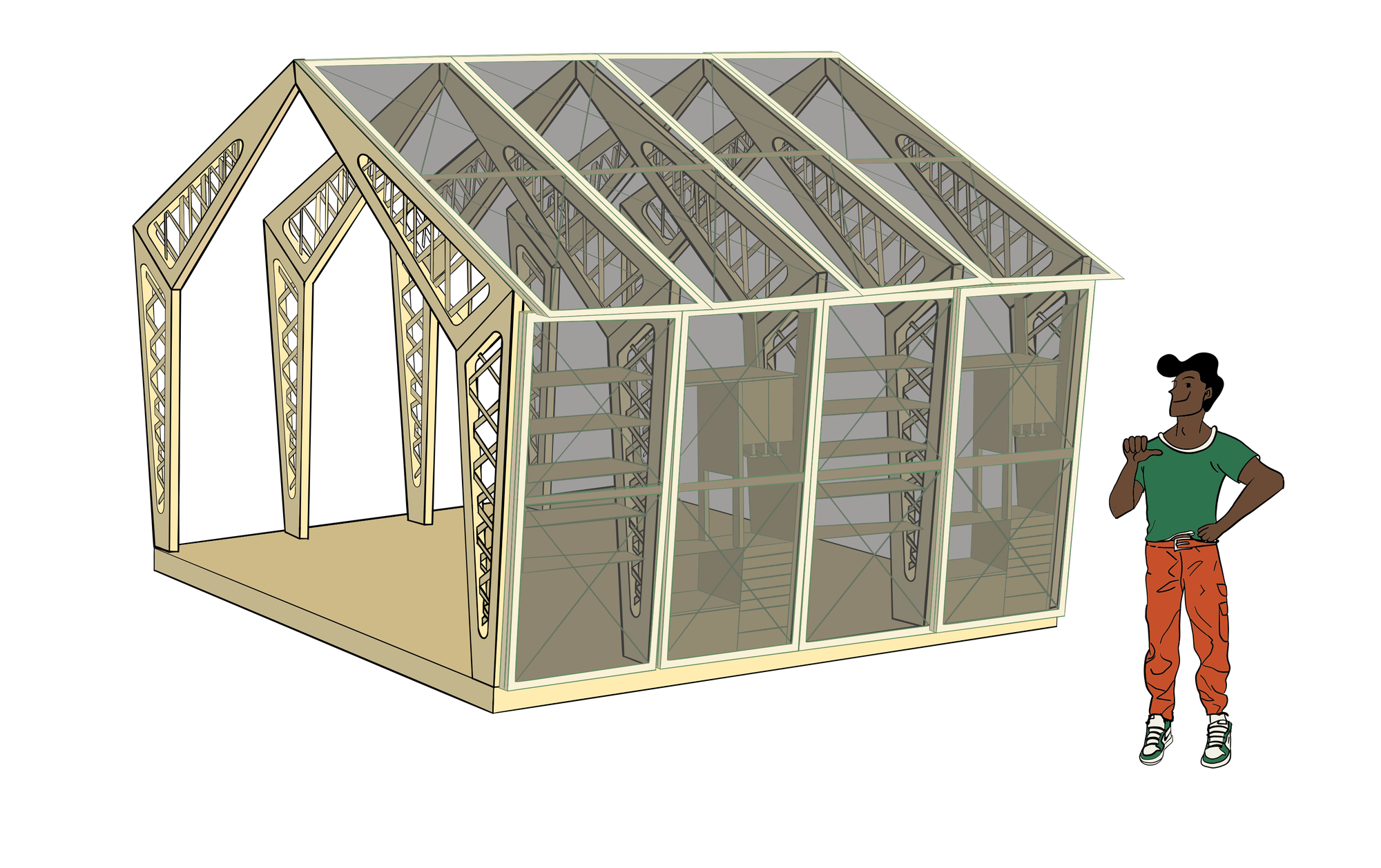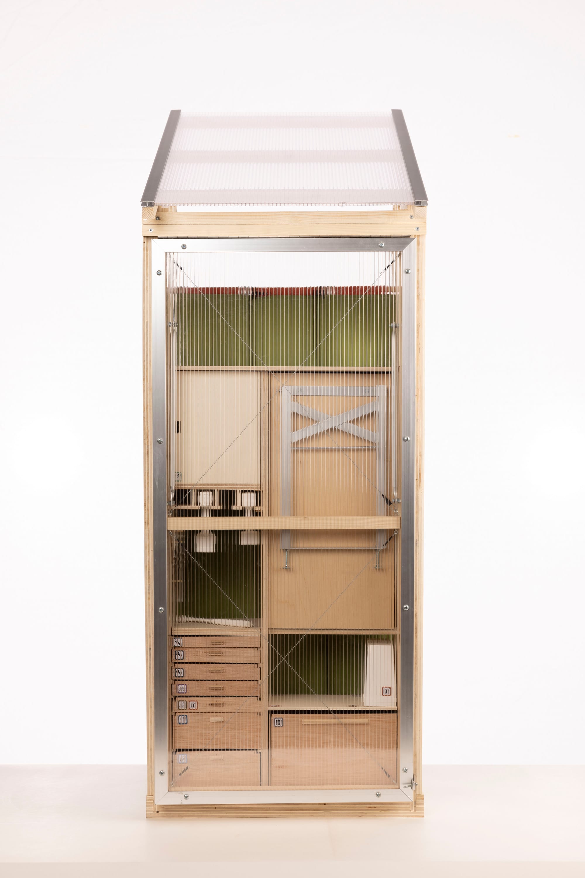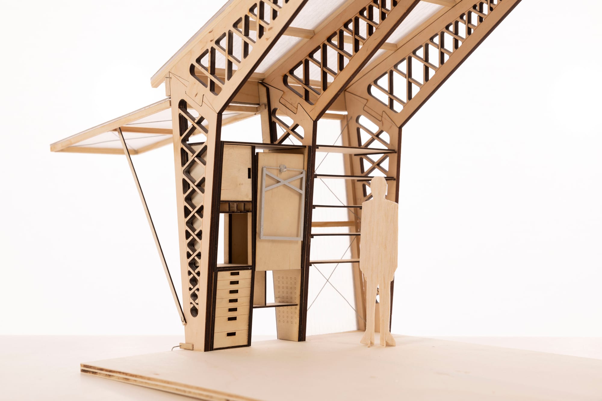 that are stuck together using only friction-fit connections. The assembled workshop shelf unit can be attached to the timber framing with screws, allowing for some flexibility due to built-in tolerance. The Flipshop can be upgraded and extended by a storage shelf unit in the next timber frame module. Finally, we closed the pavilion off to the side with a polycarbonate facade element that can be fixed or flipped up.
